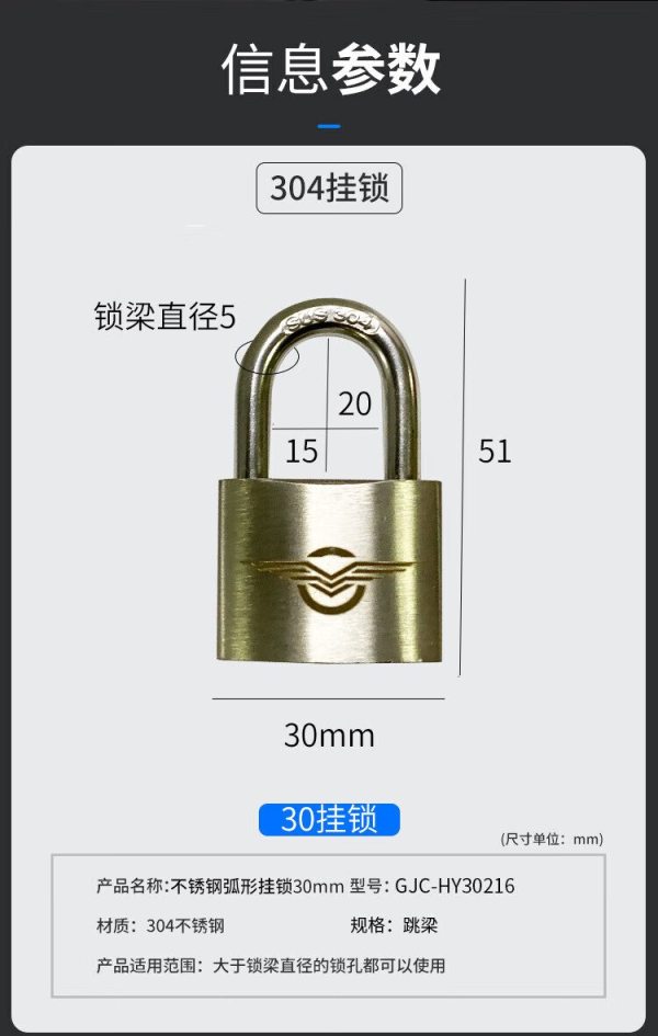 商品名称:华翼 GJC-HY30216 不锈钢弧形挂锁30mm 跳梁 单位:个