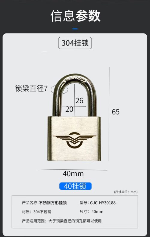 商品名称:华翼 GJC-HY30188 不锈钢挂锁 方形40mm (计价单位:个)