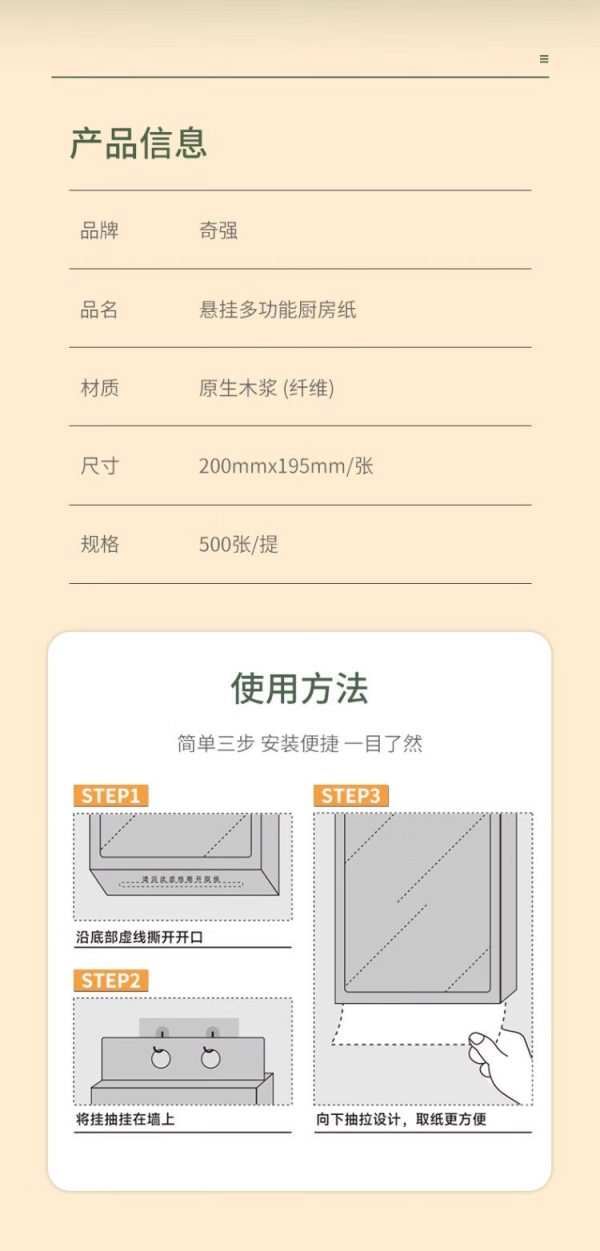 商品名称:奇强 QQZJD286 悬挂抽取式吸油纸吸水纸加厚厨房专用抽纸500张大包 2层 (200mmx195mm/张)/3提悬挂多功能厨房纸(单位:组)