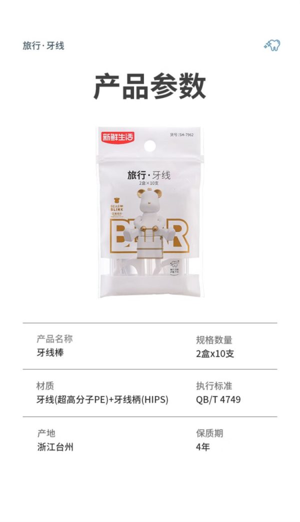 商品名称:新鲜生活 SH-7962-5 旅行单包规格:7.5cm*2盒*10支 牙线*5包(单位:组)