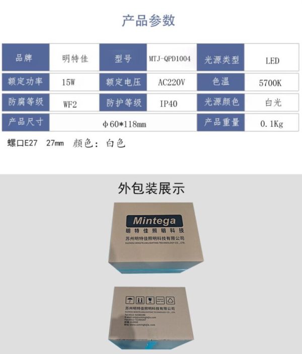 商品名称:明特佳(Mintega) MTJ-QPD1004 15W 5700K 螺口E27 27mm IP40 AC220V LED LED灯泡 1.00 个/套 (计价单位:套) 白色