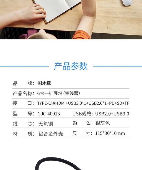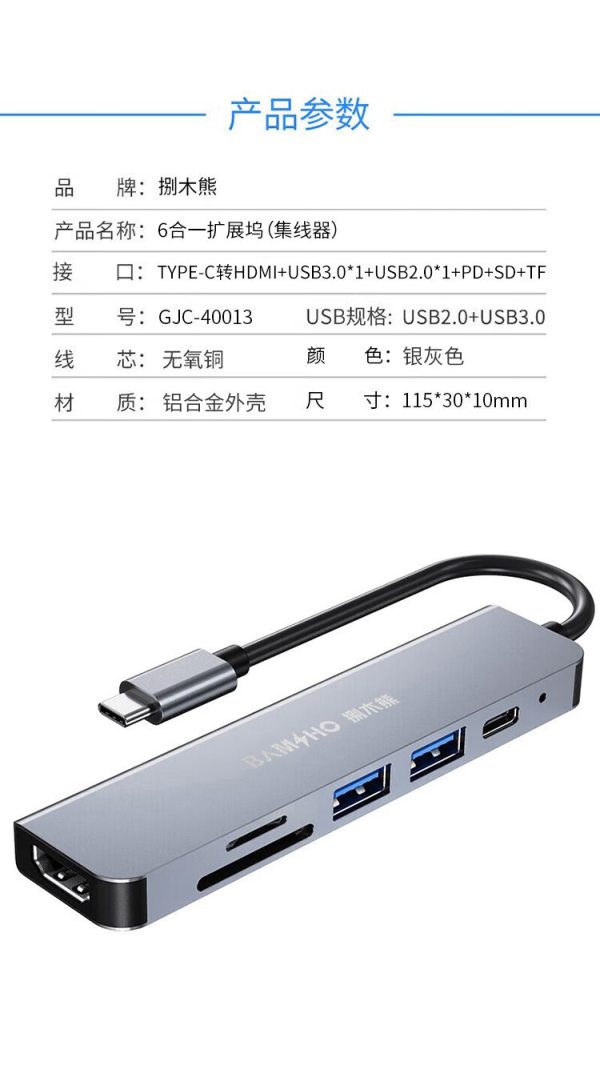 商品名称:捌木熊 GJC-40013 扩展坞(集线器)6合一 115*30*10mm 银灰色 (单位:个)