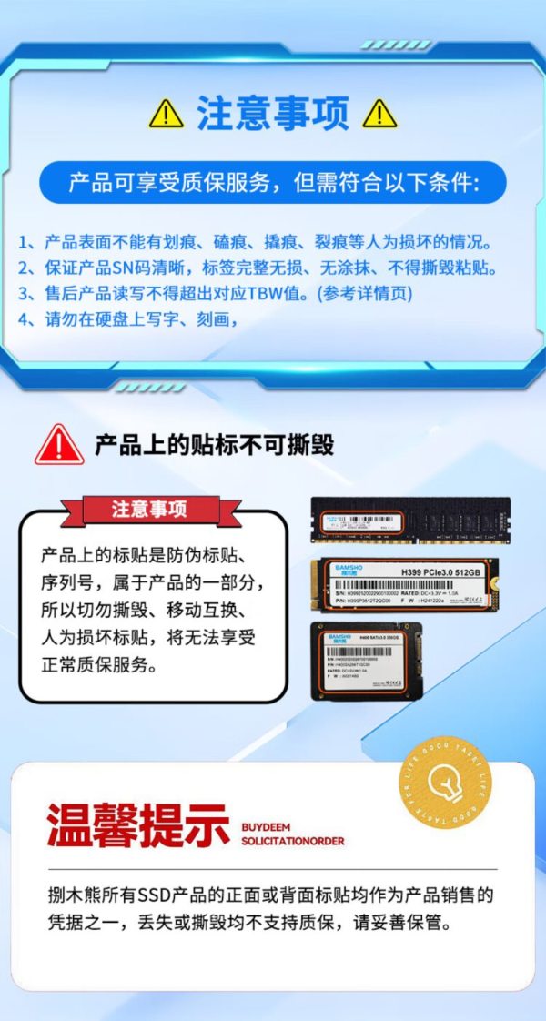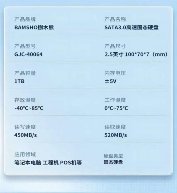 商品名称:捌木熊 GJC-40064 SATA3.0高速固态硬盘 1T 单位(个)
