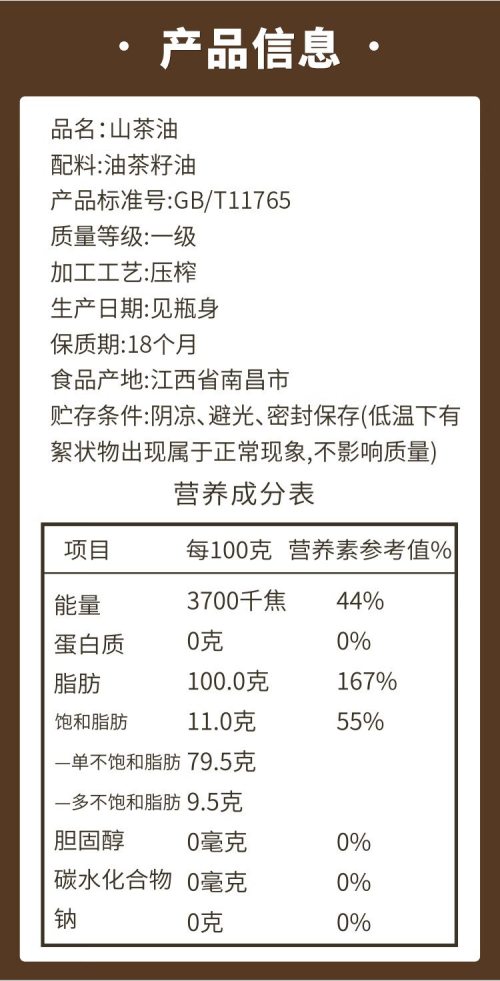 商品名称:中油品香 有机压榨山茶籽油500ml*2(计价单位:盒)