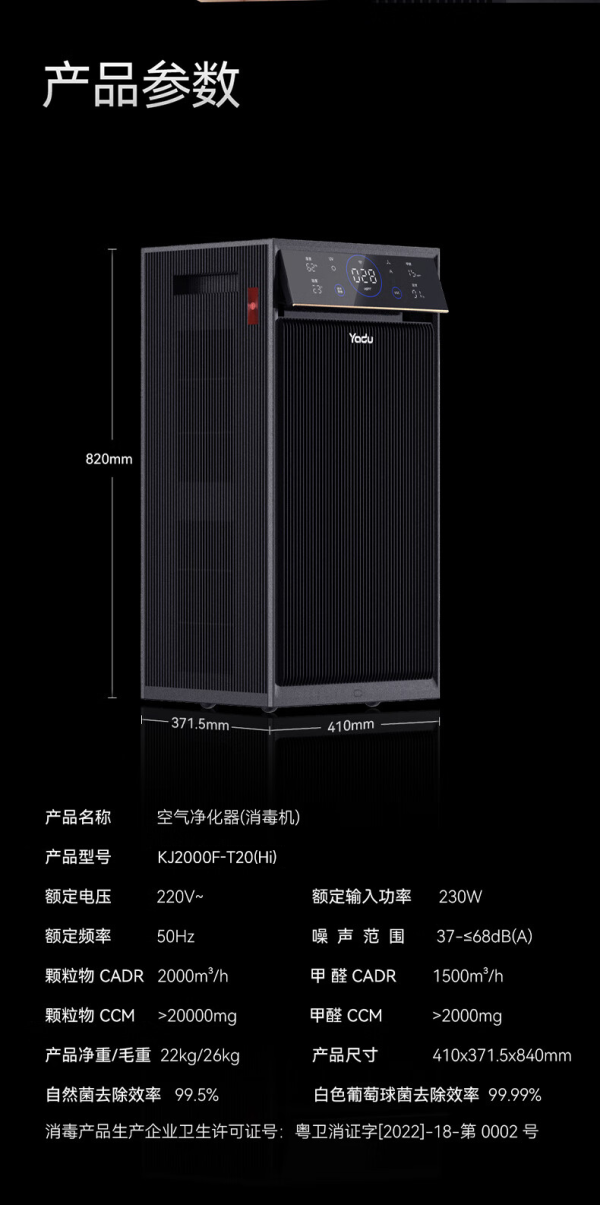 商品名称:亚都KJ2000F-T20(Hi)空气净化消毒机 单位:台
