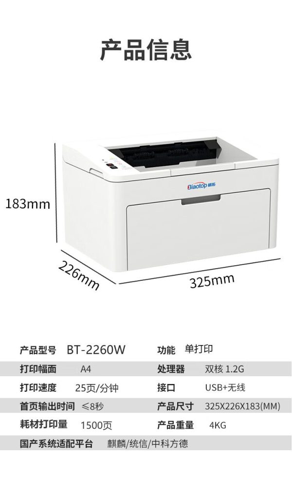 商品名称:标拓-A4单打印机 BT-2260W,商用经济型办公打印机 适配麒麟/统信/中科方德系统