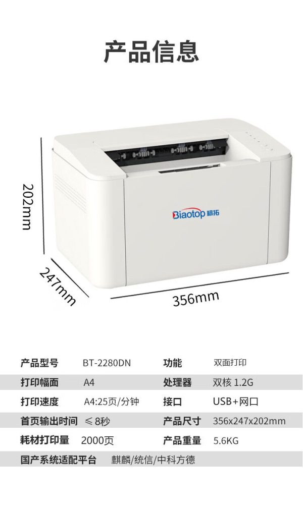 商品名称:标拓BT-2280DN A4激光黑白双面打印机 A4文档打印 商用经济型办公打印机 适配麒麟/统信/中科方德系统