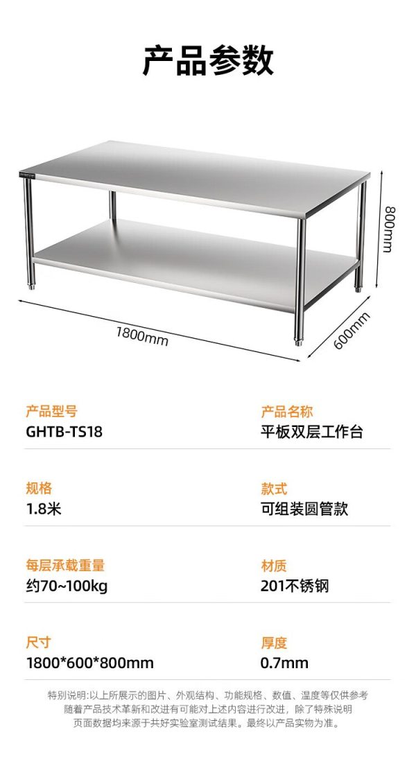 商品名称:共好酒店饭店厨房工作台 不锈钢组装打荷台商用 食堂平板双层收纳操作台 GHTB-TS18