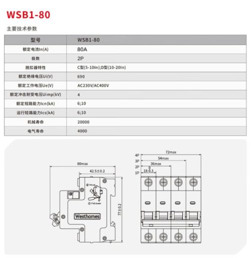 商品名称:西屋(Westhomes)WSB1-80 2P C80A 空气开关 小型断路器(单位:个)
