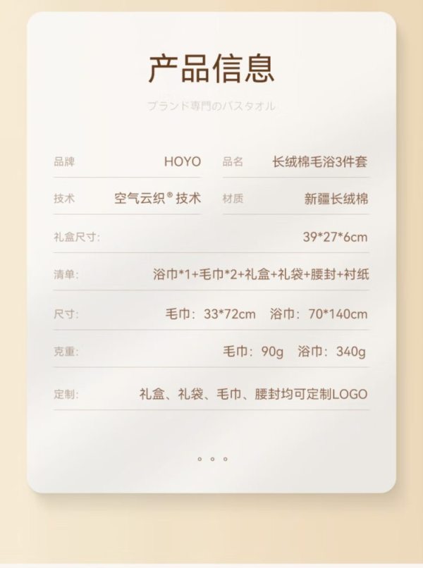 商品名称:HOYO 毛巾/浴巾3503 33*72cm90g/70*140cm340g三件套浅咖(盒)