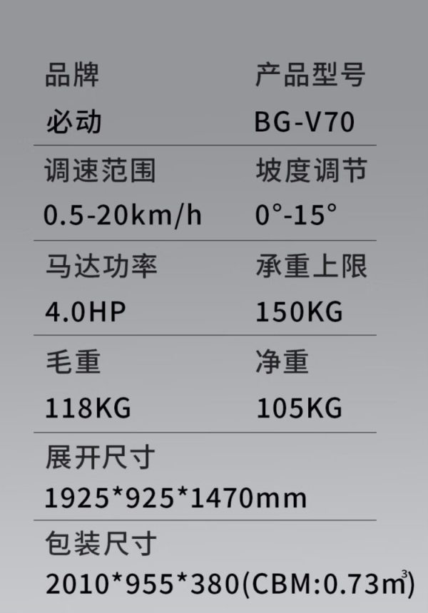 商品名称:必动(BESSGYM) BG-V70 1925*925*1470mm 跑步机 (计价单位:台)