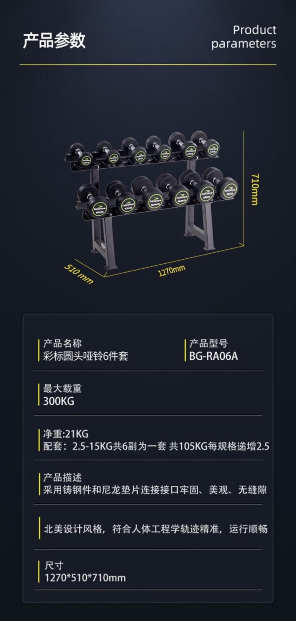 商品名称:必动(BESSGYM) BG-RA06A 1270*510*710mm 六位哑铃架+105KG彩标圆头哑铃 哑铃6件套 (计价单位:套)
