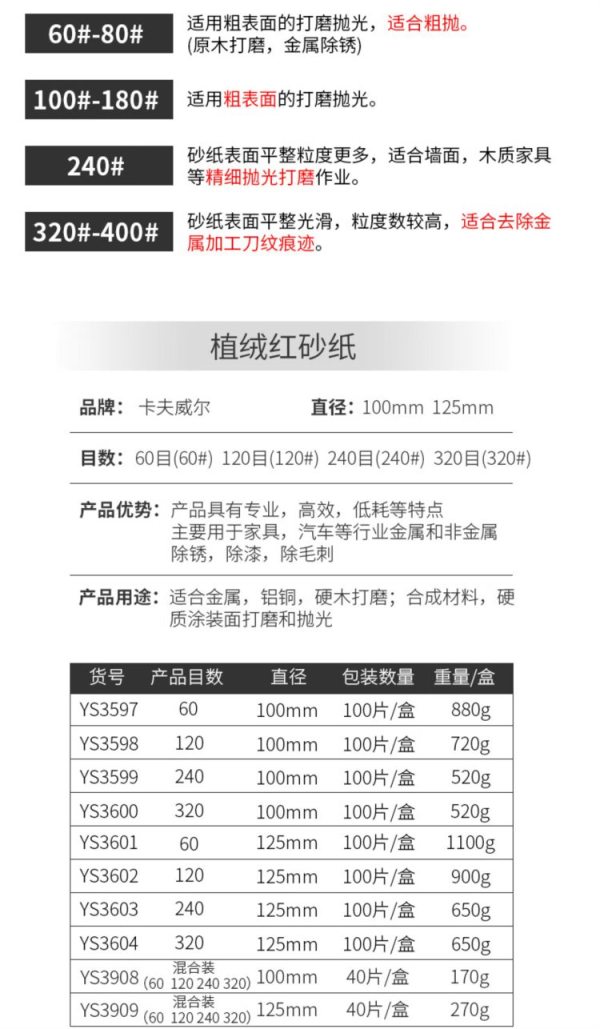 商品名称:卡夫威尔 YS3603 240目125mm(100片) 砂纸磨片 (计价单位:套)