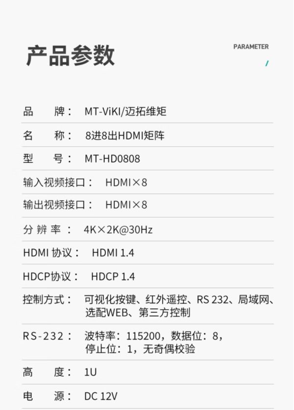 商品名称:迈拓维矩 MT-HD0808 8进8出 切换器 (计价单位:台)