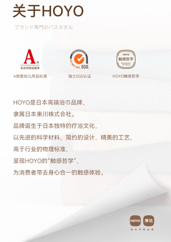 HOYO品牌诞生于日本独特的疗浴文化,秉承"触感哲学"理念,以先进的科学材料、简约优雅的设计、精湛的工艺打造每一款产品。其浴巾系列采用高于行业标准的特种纤维,经过72道精密工艺制作而成,不仅具有超乎寻常的柔软触感,更拥有出色的吸水性、耐用性和抑菌性能,为消费者带来身心合一的沐浴体验。