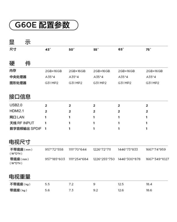 商品名称:TCL 65G60E 65英寸2+16GB 电视 (计价单位:台)