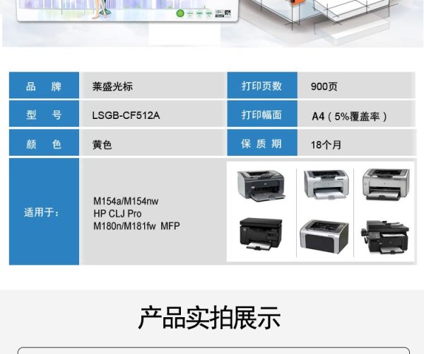 商品名称:莱盛光标 LSGB-CF512A 900页 适用于 HP M154A, 154NW, 180N, 181FW 硒鼓 黄色 (计价单位:支)