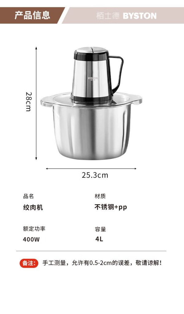 商品名称:栢士德BYSTON 绞肉机 BSD-JR014 4.0L