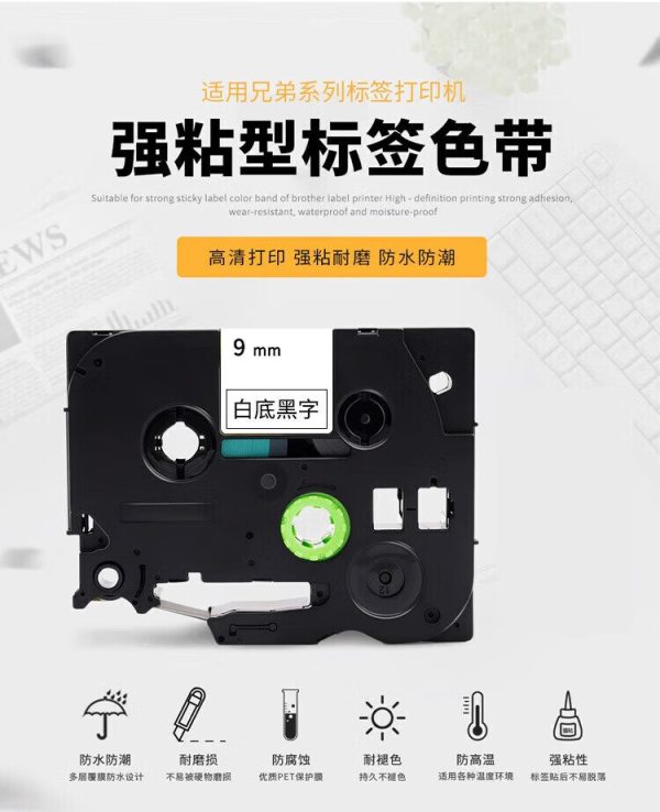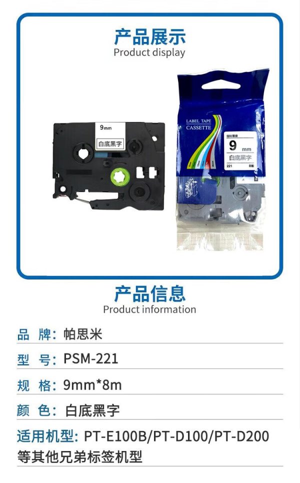 商品名称:帕思米 PSM-221适用兄弟标签机色带标签纸 规格9mm*8m白底黑字