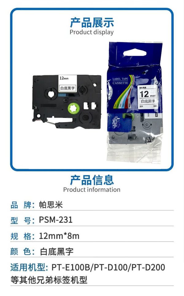 商品名称:帕思米 PSM-231适用兄弟标签机色带标签纸 规格12mm*8m白底黑字