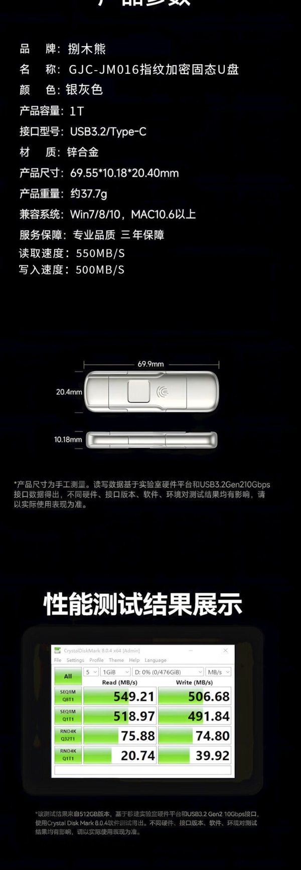 商品名称:捌木熊GJC-JM016指纹加密固态U盘1T(单位:个)