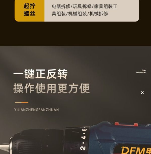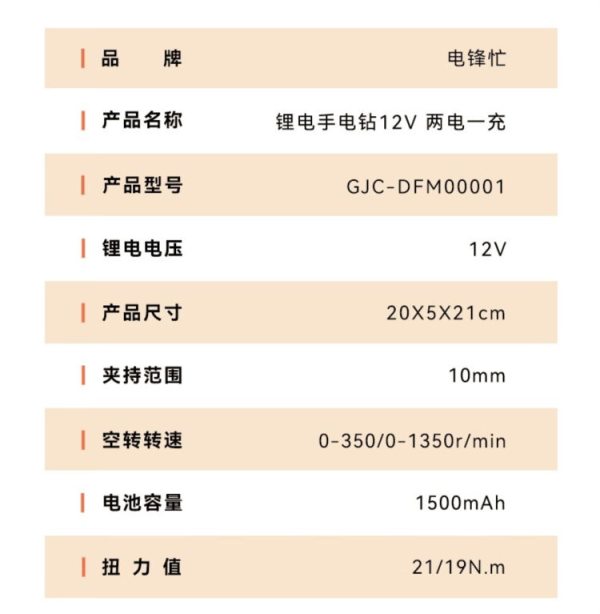 商品名称:电锋忙 GJC-DFM00001 锂电手电钻12V 两电一充 单位:套