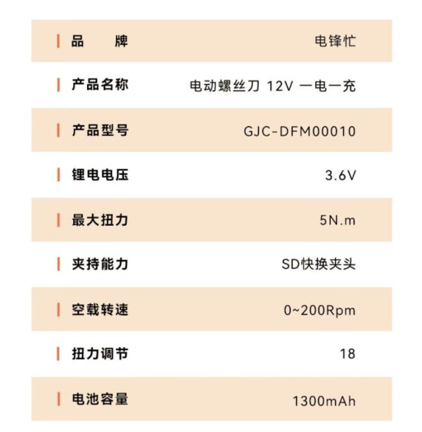 商品名称:电锋忙 GJC-DFM00010 电动螺丝刀12V 一电一充 单位:套