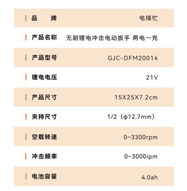 商品名称:电锋忙 GJC-DFM20014 锂电21V 无刷冲击电动扳手 4.0两电一充 单位:套