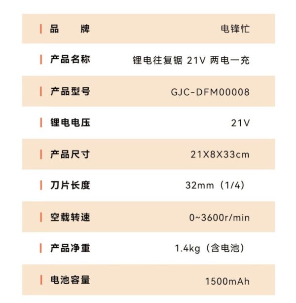 商品名称:电锋忙 GJC-DFM00008 锂电往复锯 21V 两电一充 单位:套