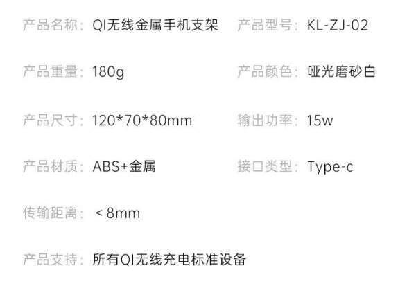 商品名称:Only&Home KL-ZJ-02 支持所有QI无线充电 QI无线金属手机支架 亚光磨砂白 (单位:个)