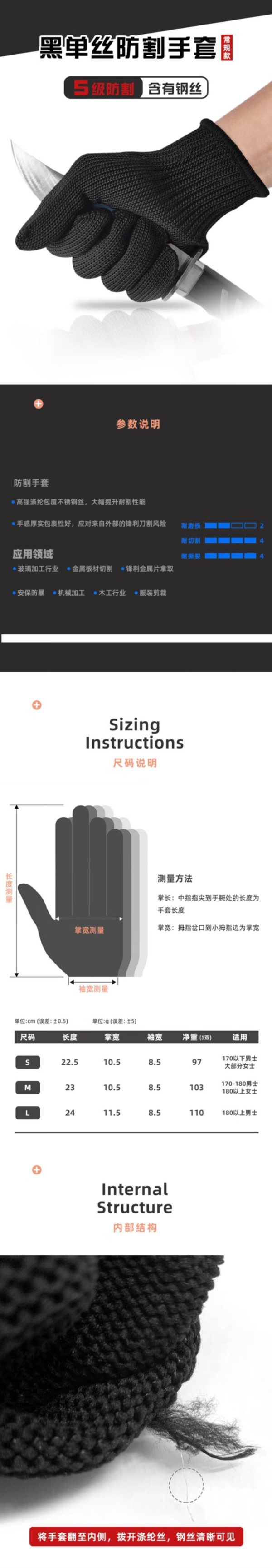商品名称:安佑全 防切割耐磨手套5级防割防刺手套 内含钢丝 M (单位:双)