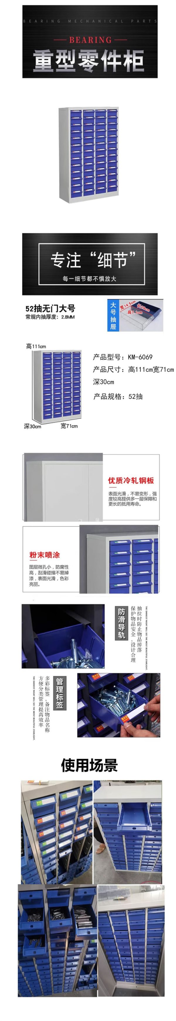 宽迈 52抽无门大号零件柜抽屉式重型工具柜收纳柜KM-6069 111*71*30cm(蓝色)