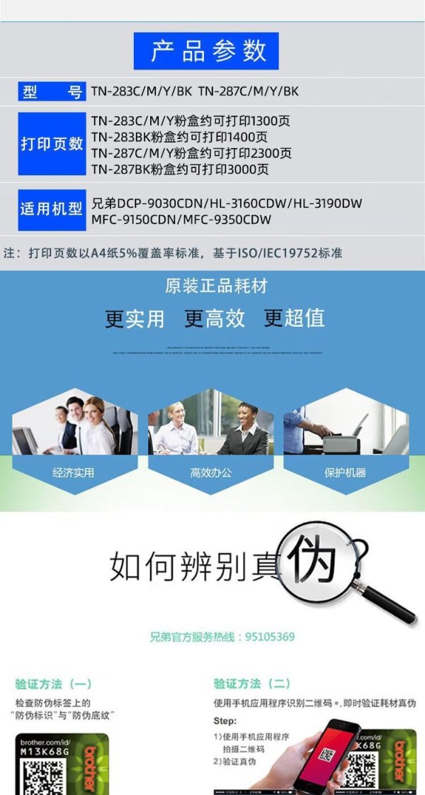 商品名称:兄弟(brother) TN-283 黑色1400页 彩色1300页 适用于DCP-9030CDN HL-3160CDW HL-3190C MFC9150 9350CDW 打印机 墨粉盒 四色(黑/青/黄/品红) (计价单位:套)