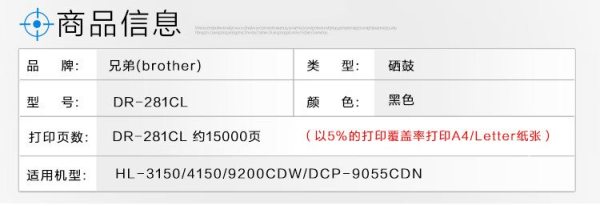 商品名称:兄弟(brother) DR-281CL 15000页 适用机型DCP-9020CDN HL-3150CDN HL-3170CDW MFC-9140CDN MFC-9340CDW 墨盒 四色(黑青红黄) (计价单位:套)