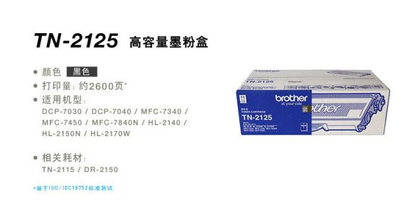 商品名称:兄弟(brother) TN-2125 打印页数 2600页 适用HL2140 2150N DCP7030,MFC7450/7340 打印机墨水 黑色 (计价单位:盒)