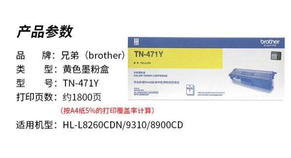 商品名称:兄弟(brother) TN-471Y 1800页 适用于L8260CDN HL-L9310CDW MFC-L8900CDW 墨盒 黄色 (计价单位:盒)