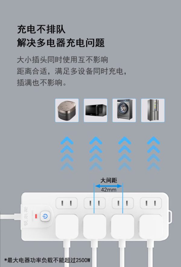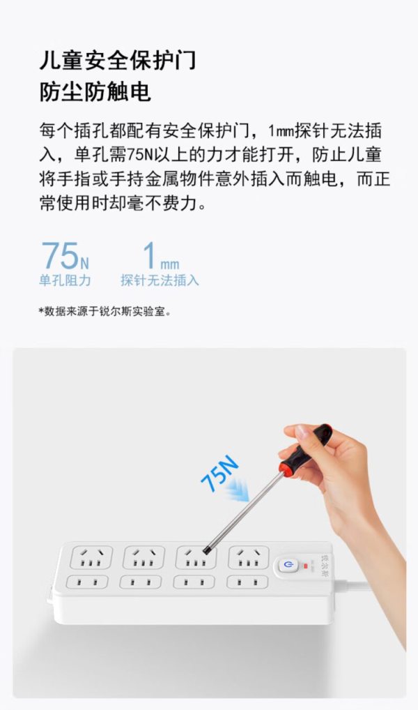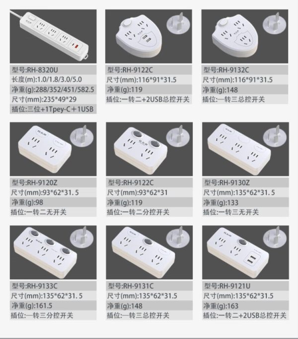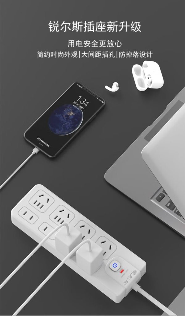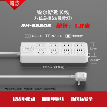 商品名称:锐尔斯 RH-6880B 八位总控开关,过载保护延长线插座全长1.8米 瓷白色(计价单位:个)