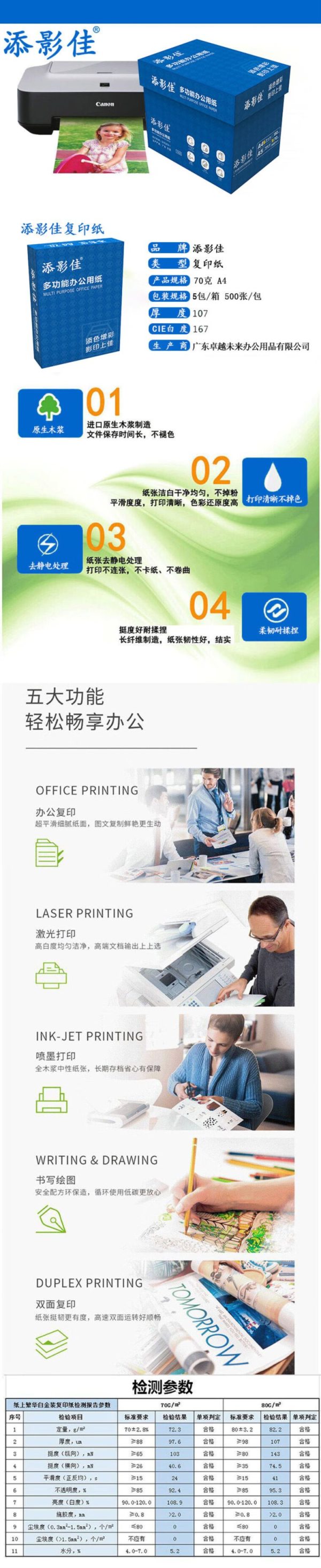 商品名称:添影佳 A4 70克 多功能办公用纸复印纸 5包/箱 500张/包