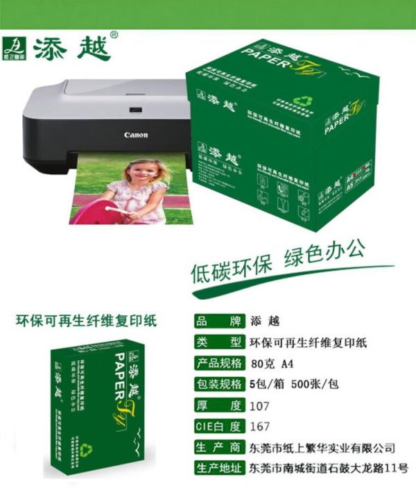 商品名称:添越 A4 80g 500张/包 5包/箱 环保可再生纤维复印纸 白色 (计价单位:箱)