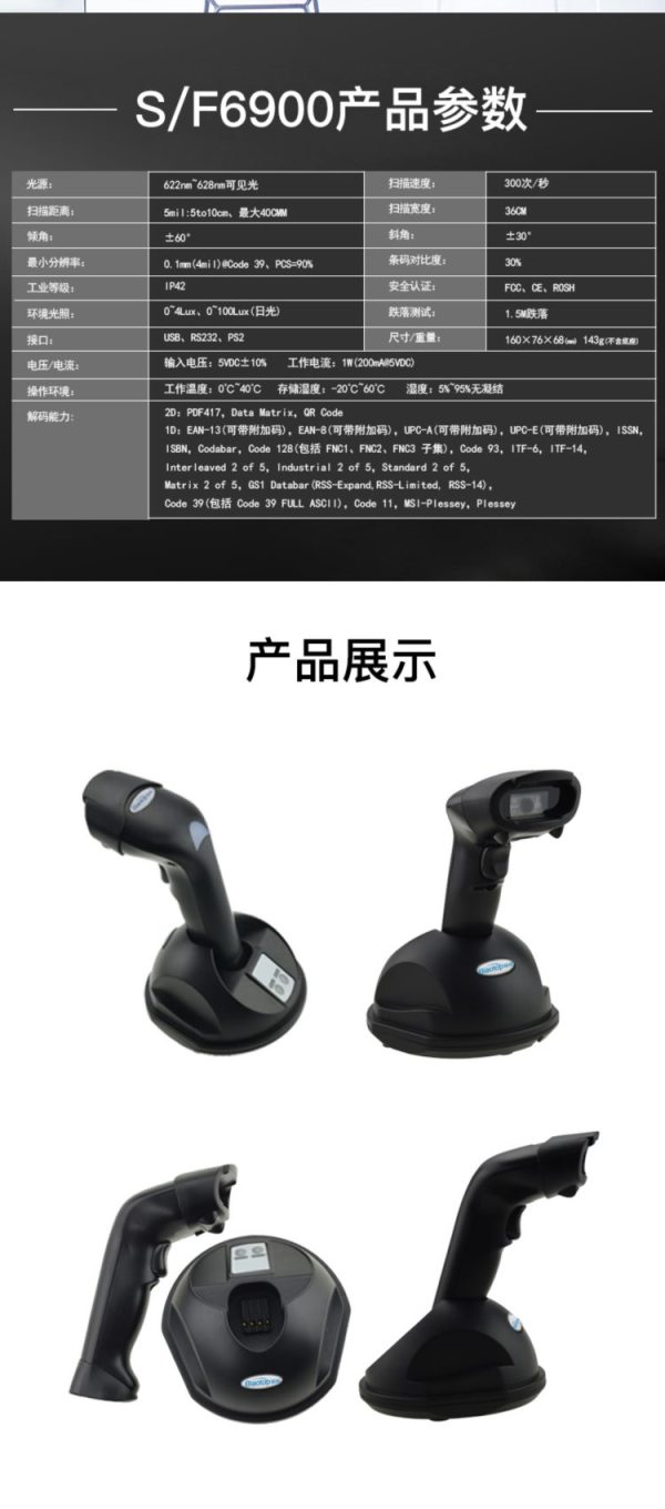 商品名称:标拓(Biaotop)F6900二维无线扫描枪自带充电底座收银机扫描超市条码收银微信支付扫码
