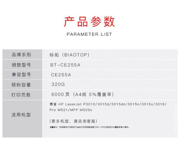 商品名称:标拓 BT-CE255A 打印量6000页 适用惠普HP LaserJet P3010/3015d/3016/Pro M521/MFP M525c打印机 畅蓝系列 硒鼓 黑色 (计价单位:支)