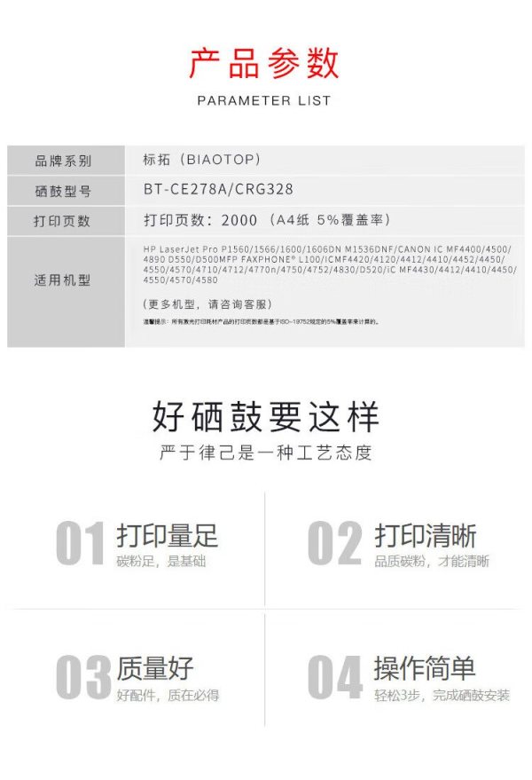 商品名称:标拓 BT-CE278A/CRG328 打印量2000页 适用佳能MF4712/4752 LBP6230DN/L150 硒鼓 黑色 (计价单位:支)