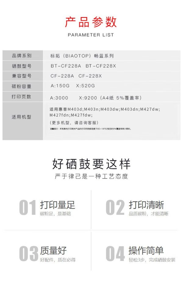 商品名称:标拓 BT-CF228X 打印量9200页 适用于:惠普HP LaserJet Pro 400 M403 硒鼓 黑色 (计价单位:支)