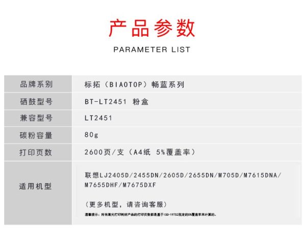 商品名称:标拓 BT-LT2451 打印量2600页 适用联想LJ2405D LJ2455D LJ2605D LJ2655DN M7605D M7615DNA 粉盒 黑色 (计价单位:支)