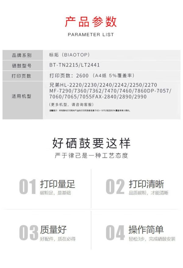 商品名称:标拓 BT-TN2215/LT2441 打印量2600页 适用于兄弟DCP7057/MFC7360/HL2240/7400/LJ2400L 粉盒 黑色 (计价单位:支)
