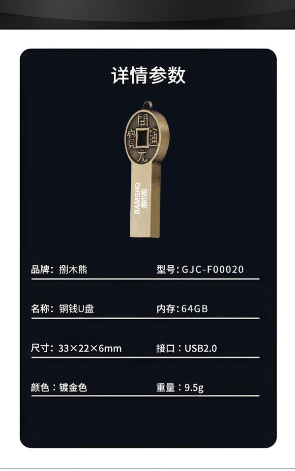 商品名称:捌木熊GJC-F00020铜钱U盘64G(单位:个)