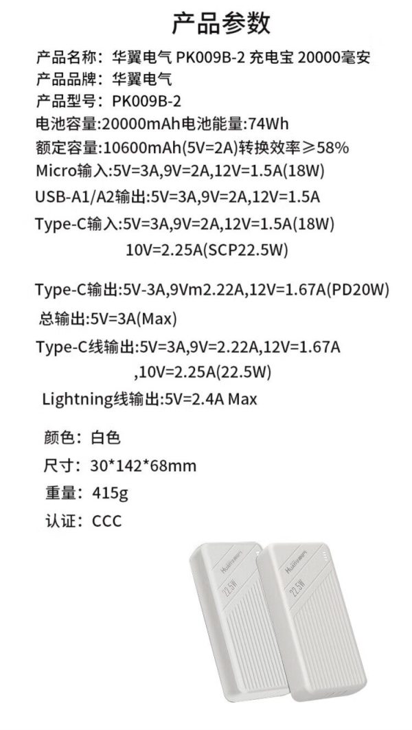 商品名称:华翼电气 PK009B-2 充电宝 20000毫安(单位:个)颜色可选 黑色/白色