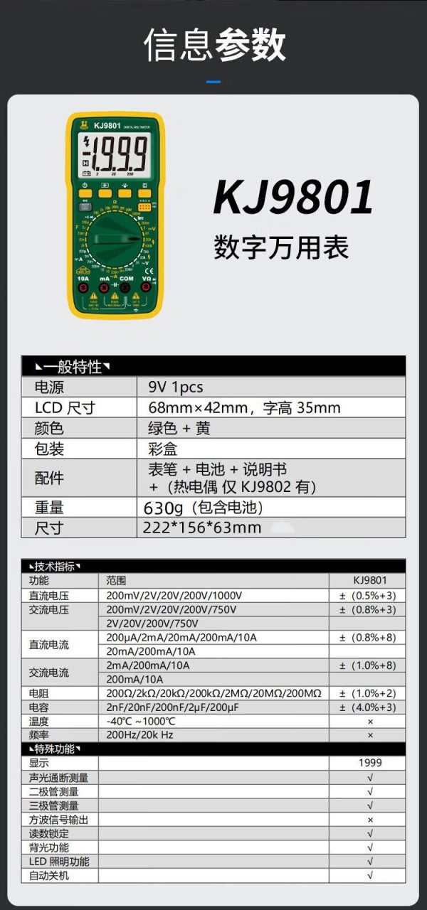 商品名称:科捷(KJ) KJ9801 直流电压 200mV/2V/20V/200V/1000V 万用表 绿+黄 (计价单位:台)