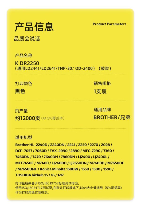 商品名称:科思特(KST) DR2250专业版 打印量12000页 适用Brother HL-2240D/HL-2240DN/HL-2241/HL-2250 鼓架 黑色 (计价单位:个)