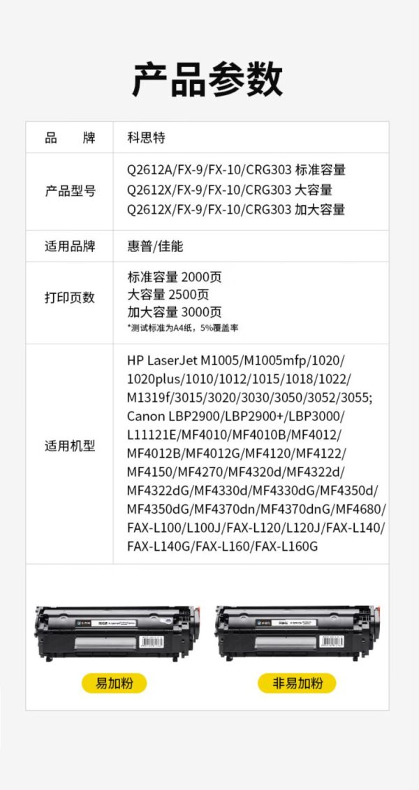 商品名称:科思特(KST) Q2612A 易加粉2000页 适用惠普M1005 1020 佳能FX-9 FX-10 CRG303 硒鼓 黑色 (计价单位:支)